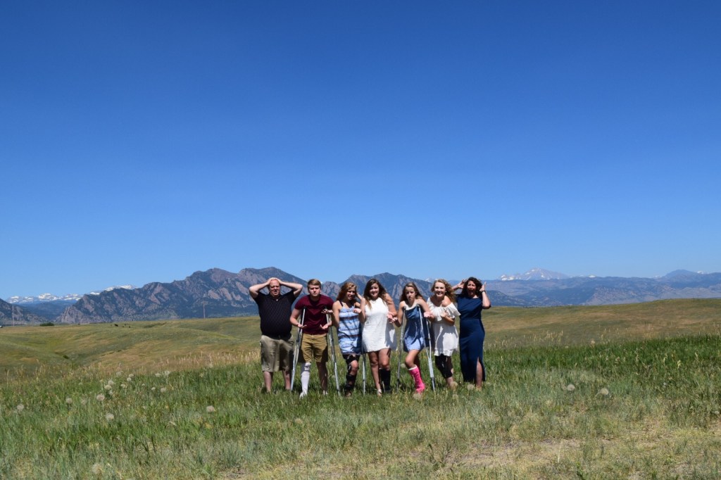 So it is July in 2017 now. Katie is in a walking boot. Alex is in a brace. Grady is on crutches 2 weeks out of surgery. Ava is on crutches with a cast on her right leg. I am on crutches, just 3 weeks post operation. So what do we do? We decide to drive to Colorado.